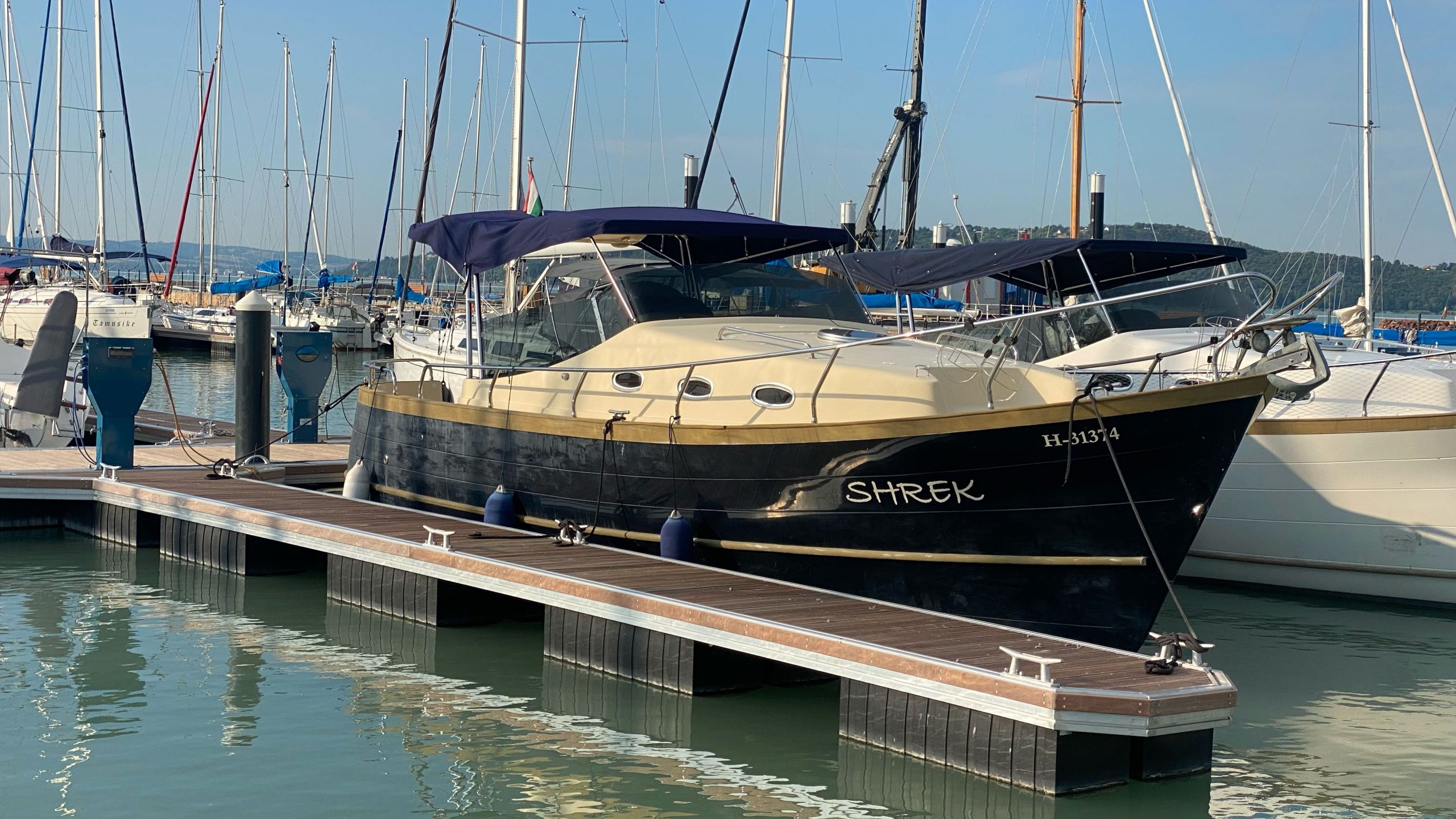 A Wia 345 – Shrek a Balaton egyik ikonikus elektromos hajója. Klasszikus formavilága, tágas fedélzete és csendes működése miatt tökéletes választás családi programokhoz, baráti összejövetelekhez vagy különleges alkalmakhoz. Csak kapitánnyal bérelhető.